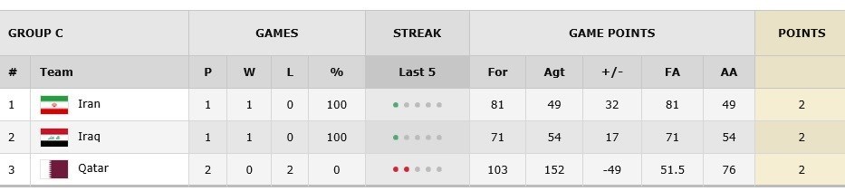 در گروه B، تیم چین تایپه 90 بر 66 هند را شکست داد. در گروه C و در جایی که ایران هم حضور دارد، تیم ملی عراق 71 بر 54 قطر را از پیش رو برداشت. قطریها، در بازی نخست خود مغلوب ایران شده بودند. در گروه A هم تیم اردن 89 بر 71 قزاقستان را مغلوب کرد.