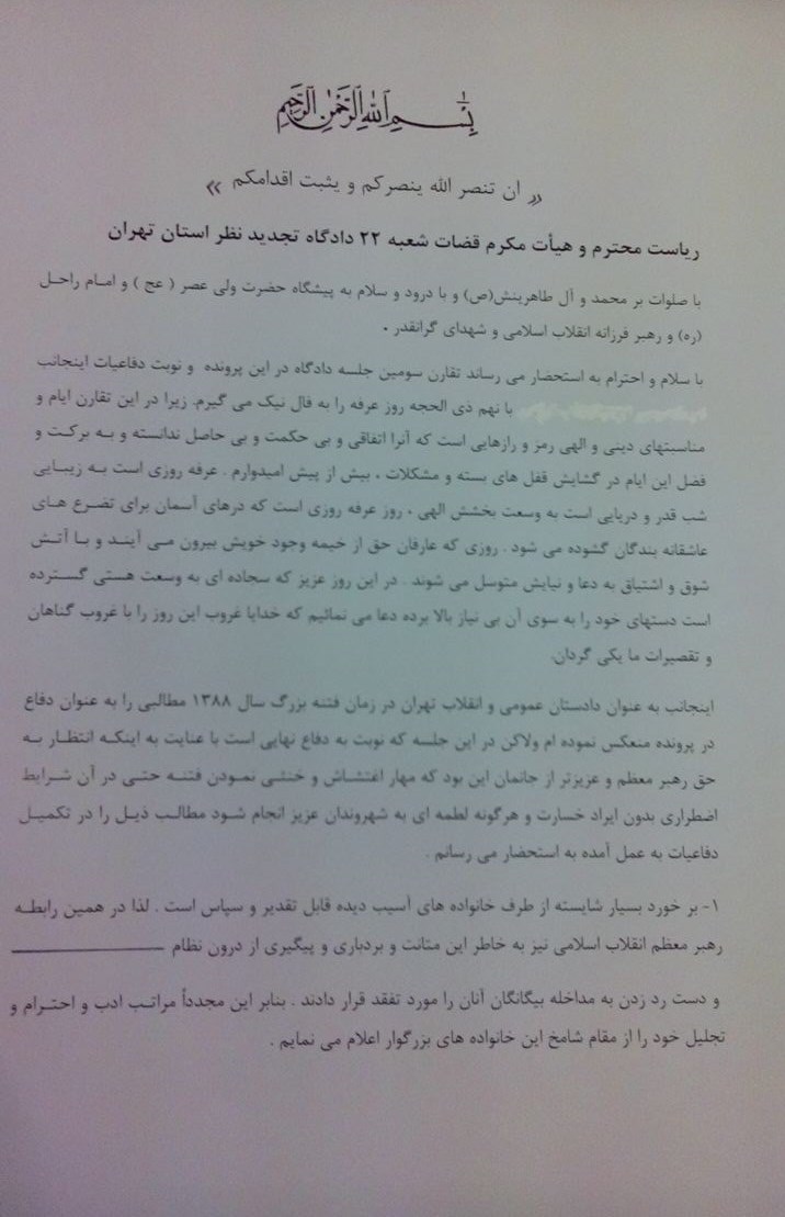 اینجانب به عنوان دادستان عمومی و انقلاب تهران در زمان فتنه بزرگ سال 1388 مطالبی را به عنوان دفاع در پرونده منعکس نمودهام ولکن در این جلسه که نوبت به دفاع نهایی است با عنایت به اینکه انتظار بهحق رهبر معظم و عزیزتر از جانمان این بود که مهار اغتشاش و خنثی نمودن فتنه حتی در آن شرایظ اضطراری بدون ایراد خسارت و هرگونه لطمهای به شهروندان عزیر انجام شود مطالب ذیل را در تکمیل دفاعیات به عمل آمده به استحضار میرساند: