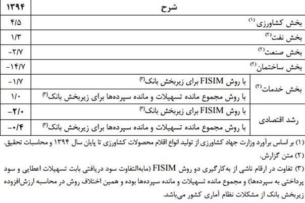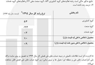 مرکز آمار ایران برای سال 94، نرخ رشد اقتصادی را یک درصد و رشد بخشهای کشاورزی، نفت، صنعت، ساختمان و خدمات را به ترتیب برابر با 5.4 3.6 ،منفی 0.3 ، منفی 16.4 و 0.2 درصد اعلام کرده است.