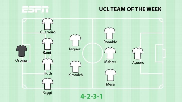 به گزارش خبرگزاری تسنیم، با پایان یافتن دور اول از مرحله گروهی فصل 17-2016 لیگ قهرمانان اروپا، شبکه تلویزیونی «ESPN» اقدام به معرفی تیم منتخب این دور از رقابت‌ها که بازی‌هایش در روزهای سه‌شنبه و چهارشنبه برگزار شد، کرد. در تیم منتخب هفته اول مرحله گروهی لیگ قهرمانان نام لیونل مسی و کریستیانو رونالدو هم دیده می‌شود.