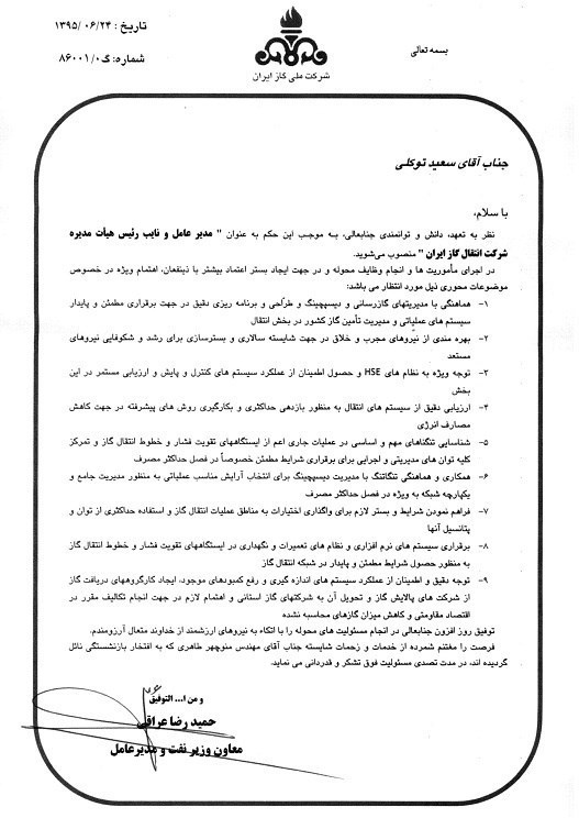 به گزارش خبرنگار اقتصادی خبرگزاری تسنیم، «حمیدرضا عراقی» مدیرعامل شرکت ملی گاز ایران با صدور حکمی «سعید توکلی» را به عنوان مدیرعامل و نایب رئیس هیئت مدیره شرکت انتقال گاز ایران منصوب کرد.