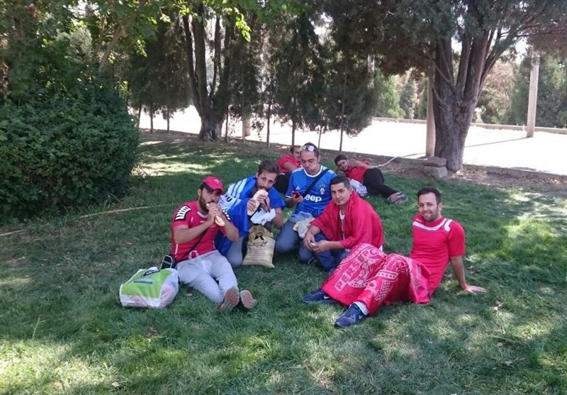 * در داخل ورزشگاه هواداران زیادی مشغول صرف ناهار روی چمن‌ها هستند.