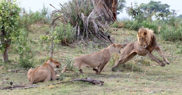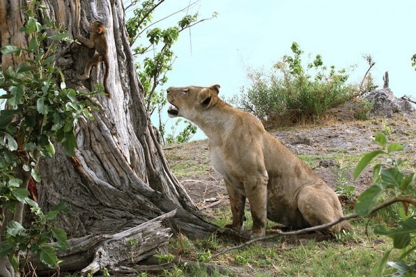 در کش و قوس درگیری شیرها یک بابون نر بالغ که از روی درختی در مجاورت شیرها شاهد ماجراست به سرعت خود را به بچه بابون رسانده و او را به بالای درخت منتقل میکند.