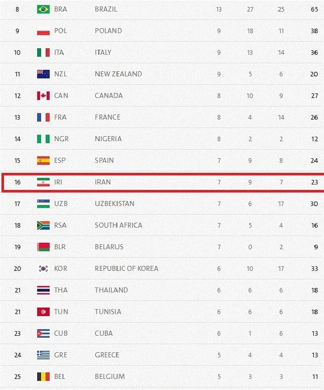 جدول ردهبندی توزیع مدالها تا پایان روز دهم به شرح زیر است: