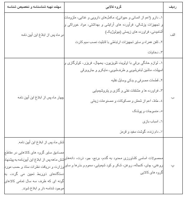 همچنین برمبنای ماده 3، آیین نامه اجرایی شناسه و رهگیری کالا در قانون مبارزه با قاچاق کالا و ارز، تهیه شناسنامه و تخصیص شناسه کالا، طبق اولویتها و زمانبندی زیر انجام میشود.
