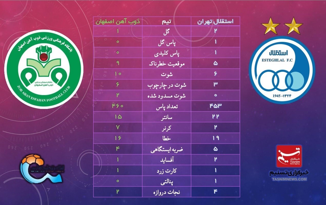 شاگردان یحیی گلمحمدی در خلق موقعیت، شوت به دروازه، شوت در چارچوب، تعداد پاس و چند آمار دیگر نسبت به شاگردان علیرضا منصوریان برتری داشتند. البته ذوبآهنیها نتوانستند برتریشان را در نتیجه ثابت کنند و بازی را با نتیجه 2 بر یک واگذار کردند.