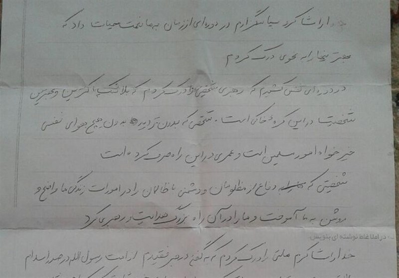 در دست‌نوشته شهید آمده است خدا را شاکر و سپاسگزارم در دوره‌ای از زمان به ما نعمت حیات داد که بهترین‌ها را به نحوی درک کردم،  در دوره‌ای نفس کشیدم که رهبری شخصیتی را درک کردم که بدون شک پاک‌ترین و بهترین شخصیت در این کره خاکی است.