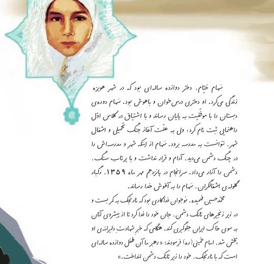 این درس همچنین به معرفی شهید حسین فمهیده به دانش‌آموزان می‌پرداخت و با اشاره به جمله معروف امام خمینی (ره) درباره این نوجوان شهید آمده بود: رهبر ما آن طفل 13 ساله‌ای است که با قلب کوچک خود با نارنجک خود را زیر تانک دشمن انداخت و آن را منهدم کرد. این جمله درمورد شهید حسین فهمیده است، او با این شجاعتش جاودانه شد و روز شهادتش را به نام روز بسیج دانش‌آموزی گرامی می‌داریم.