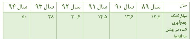 از 13.5کمک جمعآوری شده در جشن عاطفههای سال 89، مبلغ 8.1 میلیون ریال وجه نقد و طلا و جواهرات و مبلغ 5.4 میلیارد ریال کمکهای غیرنقدی و کالاهای اهدایی بوده است.