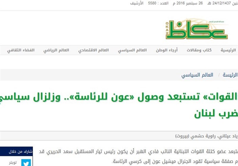 این رسانه سعودی به نقل از یک عضو حزب القوات اللبنانیه(فالانژیستهای سابق که برای رژیم صهیونیستی مزدوری میکردند و در ربودن دیپلماتهای ایرانی و تحویل آنها به اشغالگران قدس دست داشتند) به ریاست سمیر جعجع اعلام کرد معامله سیاسی سعدالحریری که منجر به رسیدن میشل عون به صندلی ریاست جمهوری شود، بعید است.