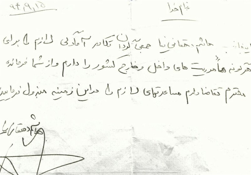 حسام را داد بغل من و شهنام خودش به اتفاق برای دیدن مادر شوهرم رفتیم پایین هاشم مثل هر ماموریتی که می رفت برخورد عادی داشت آن لحظه دل شوره‌ای نداشتم.  بچه‌ها خیلی آرام بغل هر دومان بود  مادرش یکی از بچه‌ها بغل گرفت و گفت: هاشم جان میشه نری التماسش  کرد, هاشم همان جواب روشن برای مادرش داد اونم مثل من دیگر حرفی نزد جز اینکه گفت: تو را به مادری بهتر از خودم حضرت فاطمه (س) سپردم خودش پشت و پناهت باشد.