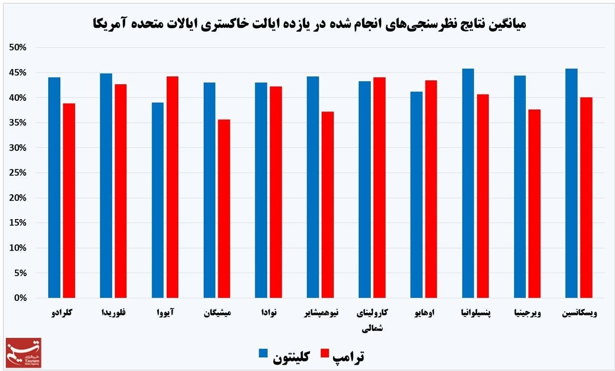 بررسی نتایج نظرسنجی‌های اخیر در این یازده ایالت نشان می‌دهد که کلینتون در مجموع همچنان از ترامپ جلوتر است، اما فاصله این دو با احتساب نظرسنجی‌های انجام شده طی هفته اخیر کاهش یافته است و ترامپ توانسته است با جلب اقبال عمومی در سه ایالت کارولینای شمالی، اوهایو و آیووا از کلینتون پیش بیفتد. بین 8 ایالت باقی‌مانده نیز کلینتون در ایالت میشیگان بیشترین اختلاف (7.4 درصد) را با ترامپ دارد.