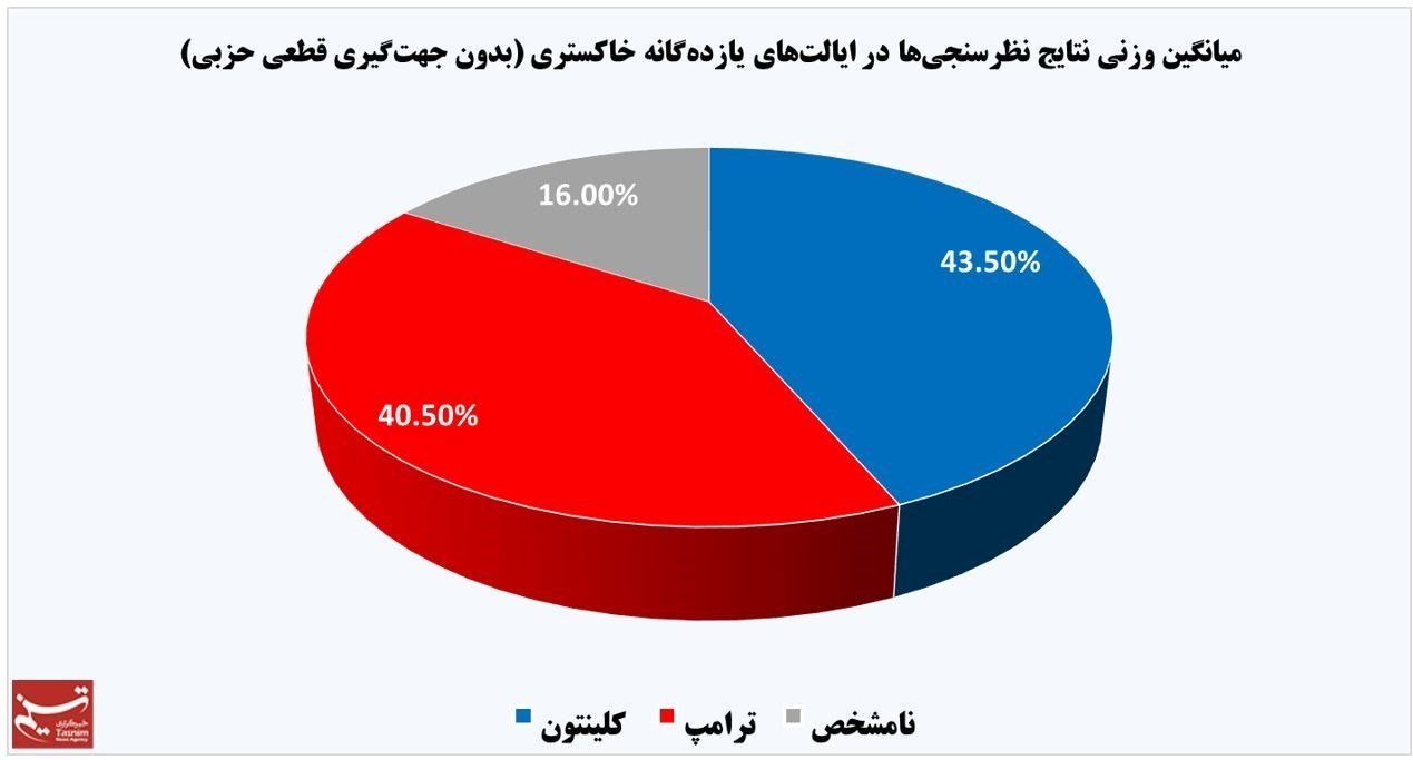 در مجموع نیز با احتساب «میانگین وزنی» ــ که از ترکیب اقبال عمومی در تمامی این ایالت‌ها به هر یک از دو نامزد و تعداد آرای الکترال هر ایالت حاصل شده است ــ هیلاری کلینتون 3 درصد جلوتر از ترامپ است، این در حالی است که اختلاف این دو براساس همین شاخص در هفته پیش برابر با 3.7 درصد بود.