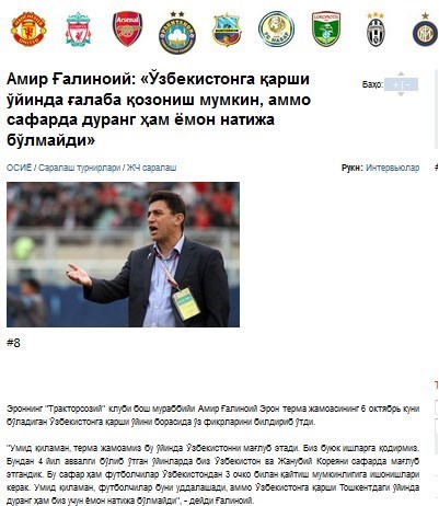 به گزارش خبرگزاری تسنیم، سایت فوتبال ازبکستان این گفته قلعهنویی را که تساوی تیم ملی ایران برابر ازبکستان نمیتواند نتیجه بدی باشد به عنوان تیتر اصلی خبر خود برگزید.