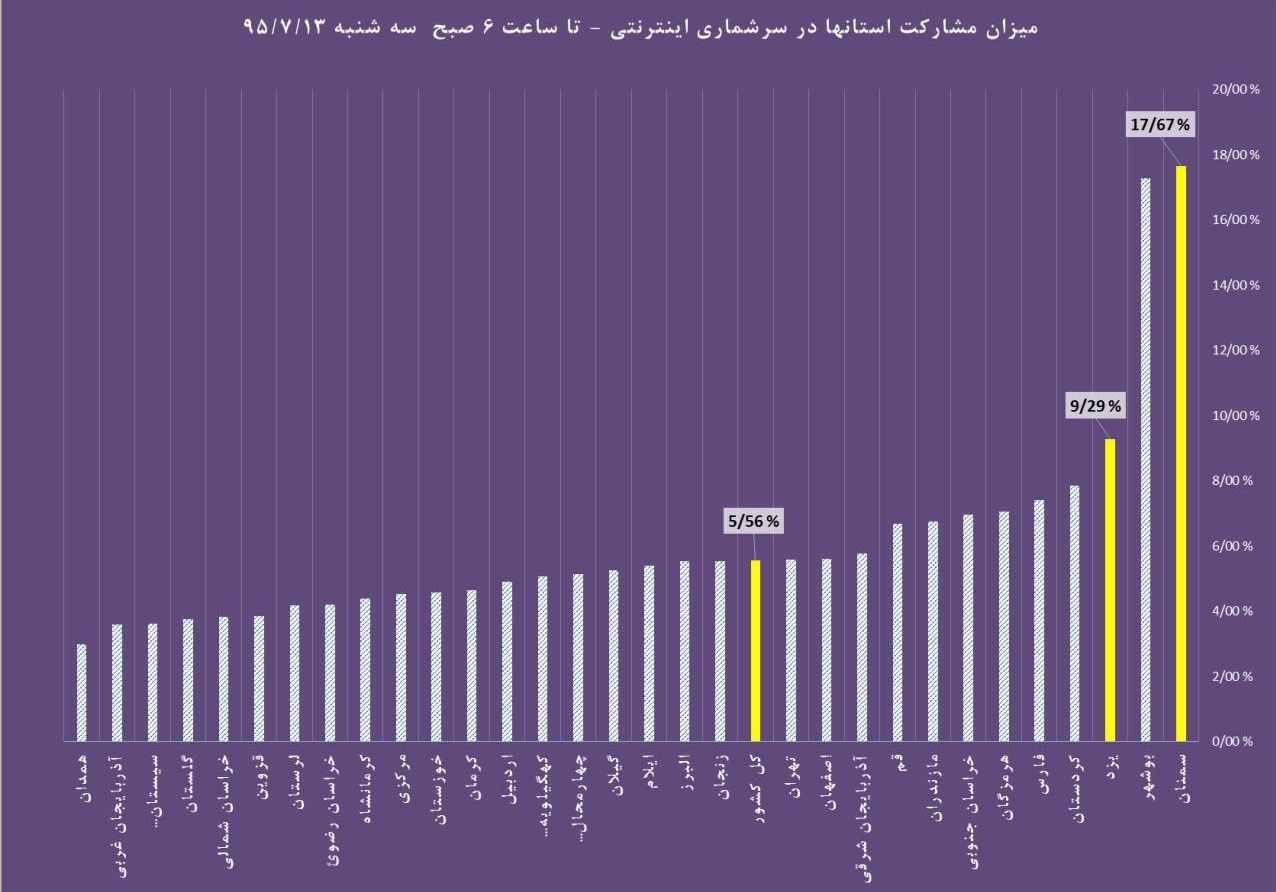 براساس اطلاعاتی که تا ساعت 6 صبح دیروز وارد شده است استان سمنان، بوشهر و یزد بیشترین مشارکت اینترنتی را در سرشماری داشتهاند و استانهای همدان، آذربایجان غربی و سیستان و بلوچستان کمترین مشارکت را در این سرشماری داشتهاند.