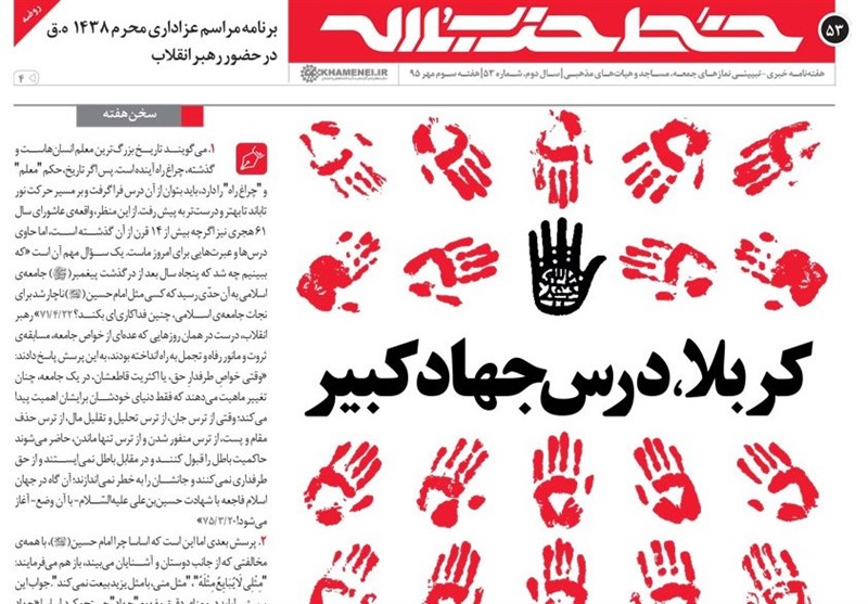 به گزارش خبرنگار سیاسی باشگاه خبرنگاران تسنیم «پویا»، پنجاه و سومین شماره هفتهنامه خبری تبیینی خط حزبالله در هفته اول محرم 1438 با تبیین حادثه بزرگ عاشورا و رفتار سیدالشهدا (علیه السلام) بهعنوان مصداق بارز عدم تبعیت از دشمنان و جهاد کبیر با عنوان «کربلا، درس جهاد کبیر» منتشر شد.