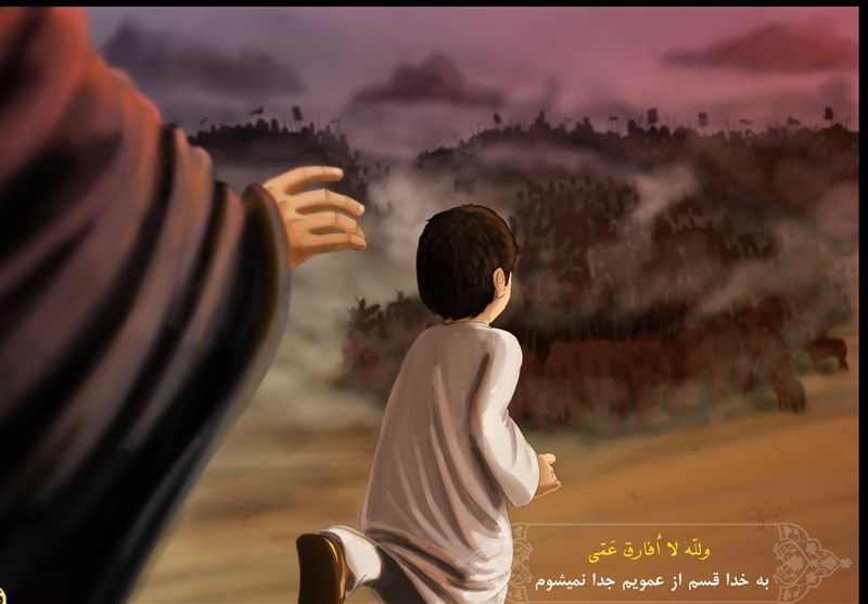 «فَلَبِثُوا هُنَیْئَةً ثُمَّ عَادُوا إِلَیْهِ وَ أَحَاطُوا بِهِ فَخَرَجَ عَبْدُ اللَّهِ بْنُ الْحَسَنِ بْنِ عَلِیٍّ ع وَ هُوَ غُلَامٌ لَمْ یُرَاهِقْ مِنْ عِنْدِ النِّسَاءِ یَشْتَدُّ حَتَّى وَقَفَ إِلَى جَنْبِ الْحُسَیْنِ ع فَلَحِقَتْهُ زَیْنَبُ بِنْتُ عَلِیٍّ ع لِتَحْبِسَهُ فَأَبَى وَ امْتَنَعَ امْتِنَاعاً شَدِیداً فَقَالَ لَا وَ اللَّهِ لَا أُفَارِقُ عَمِّی فَأَهْوَى بَحْرُ بْنُ کَعْبٍ وَ قِیلَ حَرْمَلَةُ بْنُ کَاهِلٍ إِلَى الْحُسَیْنِ ع بِالسَّیْفِ فَقَالَ لَهُ الْغُلَامُ وَیْلَکَ یَا ابْنَ الْخَبِیثَةِ أَ تَقْتُلُ عَمِّی فَضَرَبَهُ بِالسَّیْفِ فَاتَّقَاهَا الْغُلَامُ بِیَدِهِ فَأَطَنَّهَا إِلَى الْجِلْدِ فَإِذَا هِیَ مُعَلَّقَةٌ فَنَادَى الْغُلَامُ یَا أُمَّاهْ فَأَخَذَهُ الْحُسَیْنُ ع وَ ضَمَّهُ إِلَیْهِ وَ قَالَ یَا ابْنَ أَخِی اصْبِرْ عَلَى مَا نَزَلَ بِکَ وَ احْتَسِبْ فِی ذَلِکَ الْخَیْرَ فَإِنَّ اللَّهَ یُلْحِقُکَ بِآبَائِکَ الصَّالِحِینَ».