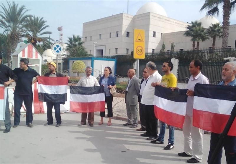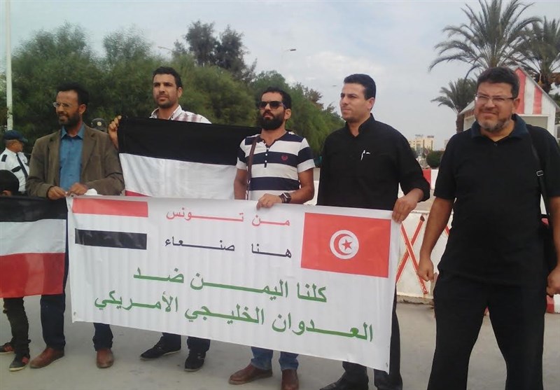 به گزارش خبرنگار خبرگزاری تسنیم در تونس، فعالان تونسی با برگزاری یک تجمع اعتراضآمیز در مقابل سفارت سعودی در این کشور، کشتارهای آل سعود علیه ملت یمن و جنایت فجیع حمله به مراسم ترحیم یمنیها را محکوم کردند.