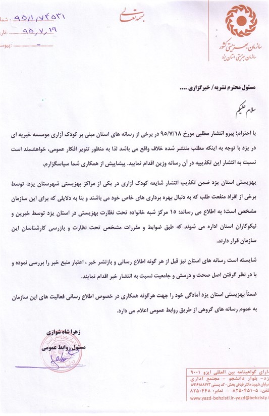 با احترام؛ پیرو انتشار مطلبی مورخ 18/7/95 در برخی از رسانههای استان مبنی بر کودک آزاری موسسه خیریهای در یزد با توجه به اینکه مطلب منتشر شده خلاف واقع میباشد، لذا به منظور تنویر افکار عمومی، خواهشمند است نسبت به انتشار این تکذیبیه در آن رسانه وزین اقدام نمایید. پیشاپیش از همکاری شما سپاسگذارم.