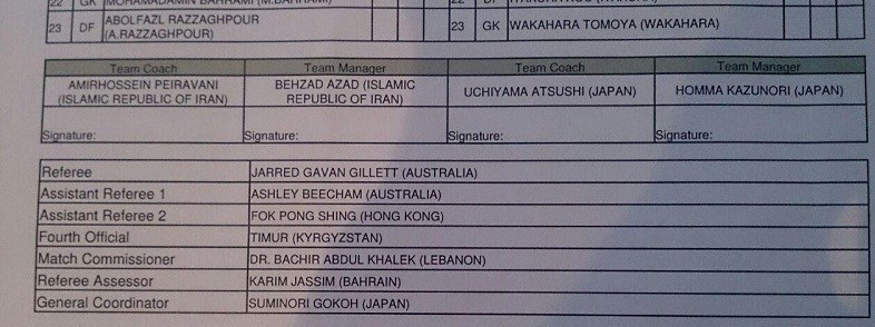تیمور از قرقیزستان داور چهارم بازی ایران و ژاپن است و عبدالخالد لبنانی نیز نظارت این بازی را بر عهده خواهد شد. ناظر داوری نیز کریم جاسم از بحرین است.