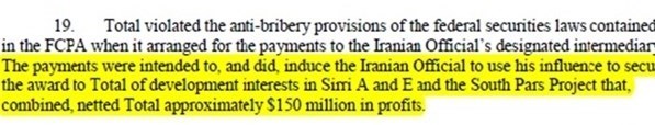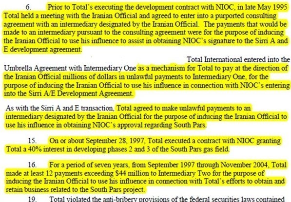 1 ــ توتال شرکت بین‌المللی متعلق به دولت فرانسه است که برای ورود به صنعت نفت ایران طی سال‌های 1995 تا 2004 (دهساله 1374 تا 1383) 60 میلیون دلار به یک مقام دولتی ایران رشوه داد و با اعمال نفوذ آن مقام توانست مبلغ 150 میلیون سود خالص اضافی به چنگ آورد؛ به‌عبارت دیگر، با احتساب 60 میلیون رشوه پرداختی، حداقل 210 میلیون دلار از منابع ملت مظلوم ایران به‌نفع یک مقام دولتی فاسد ایرانی و یک شرکت فاسد فرانسوی به یغما رفت. شرح این فساد در بیانیه کمیسیون بورس و اوراق بهادار آمریکا منتشر شده در 29 ماه مه 2013 آمده است. این کمیسیون به فساد تمام شرکت‌هایی که سهامشان در بورس نیویورک معامله می‌شود، هرچند خارجی باشند، رسیدگی می‌کند. خلاصه بیانیه 11صفحه‌ای این است: توتال در آغاز سال 1995 (دی ماه 1373) برای توسعه میدان سیری با شرکت ملی نفت ایران وارد مذاکره شد. در 10 جولای 1995، سه روز قبل از امضای قرارداد، توتال با یک مقام دولتی ایران ملاقات می‌کند و با او توافق می‌کند و به اسم مشاوره به واسطه‌ای که آن رشوه‌خوار معلوم می‌کند مبالغی پرداخت کند تا در قبال این رشوه، آن مقام از نفوذ خود در شرکت ملی نفت ایران، برای امضای قرارداد سیری استفاده کند. پرداخت‌ها با نیم میلیون دلار در جولای 1995 آغاز شد و طی 5 مرحله در دو سال و نیم به حدود 16 میلیون دلار رسید.