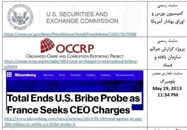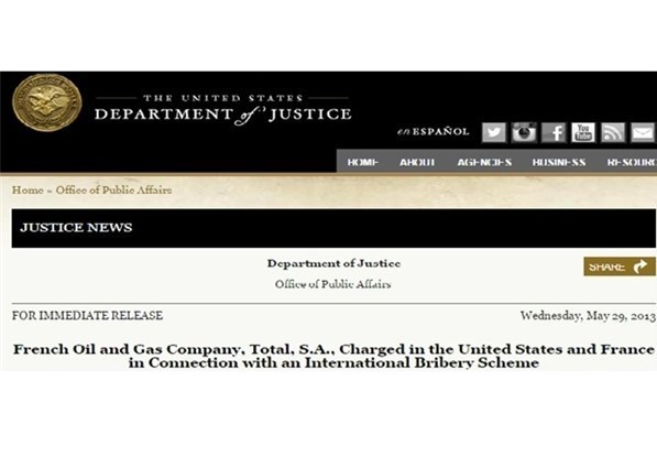 5 ــ وزارت دادگستری آمریکا در همان تاریخ 29 مه 2013 با انتشار بیانیه‌ای ضمن تأکید موارد سابق الذکر اضافه می‌کند که مقامات ذی‌ربط فرانسه در همان تاریخ مدیرعامل و رئیس هیئت مدیره توتال و دو فرد دیگر از این شرکت را به‌اتهام نقض قوانین از جمله قانون رشوه خارجی فرانسه، به دادگاه کیفری فراخواندند.