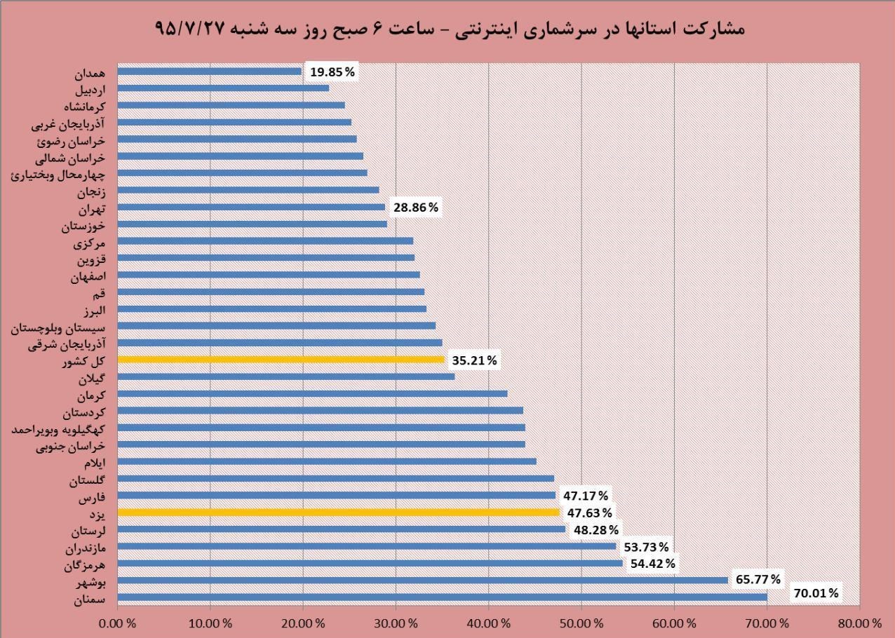 میزان مشارکت کل کشور در سرشماری اینترنتی تاکنون 35.2 درصد بوده است. استان فارس با مشارکت 47.17 درصدی هفتمین استان کشور در این زمینه است. استانهای سمنان، بوشهر و هرمزگان استانهای پیشتاز در میزان مشارکت هستند. استانهای همدان اردبیل و کرمانشاه نیز کمترین میزان مشارکت را داشتهاند.