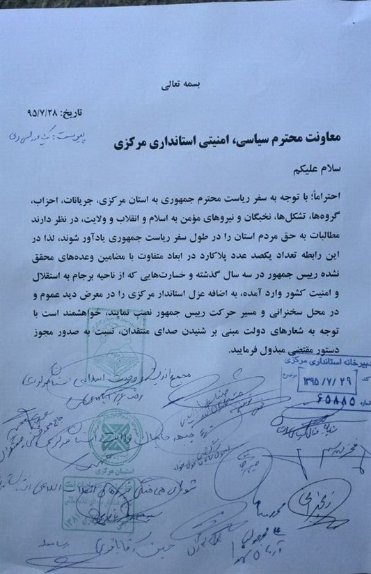 در این نامه آمده است: باتوجه به سفر ریاست محترم جمهوری به استان مرکزی، جریانات، احزاب، گروهها، تکلها، نخبگان و نیروهای مومن به اسلام و انقلاب و ولایت، در نظر دارند مطالبات به حق مردم استان را در طول سفر ریاست جمهور یادآور شوند.