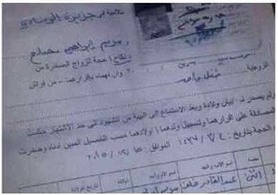به گزارش گروه رسانههای خبرگزاری تسنیم، نیروهای مسلح عراق در مناطق آزاد شده استان الانبار به اسنادی درباره ازدواج شبه نظامیان عضو گروه تروریستی داعش با دختران نابالغ دست یافته اند که هدف آنها دریافت پاداش بیشتر بوده است.یک منبع نظامی عراقی گفت که در عقد نامه های پیدا شده در شهرستان خلدیه که سال 2015 تنظیم شده است، اطلاعاتی درباره همسران داعشی ها و نوزادان متولد شده حاصل از آنها وجود دارد.