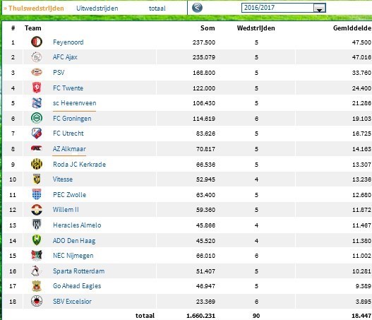 آژاکس آمستردام و پی اس وی آیندهوون به ترتیب با معدل حضور 47 هزار و 16 نفر و 33 هزار و 760 نفر در ورزشگاههای خانگی خود ردههای دوم و سوم را در اختیار دارند. در میان تیمهای دو لژیونر ایرانی، یاران قوچاننژاد وضعیت بهتری دارند. هیرنوین معدل 21 هزار و 286 تماشاگر برای هر بازی خانگی خود ثبت کرده است و رتبه پنجم پرتماشاگرترین تیم های اردویژه هلند را به خود اختصاص داد.