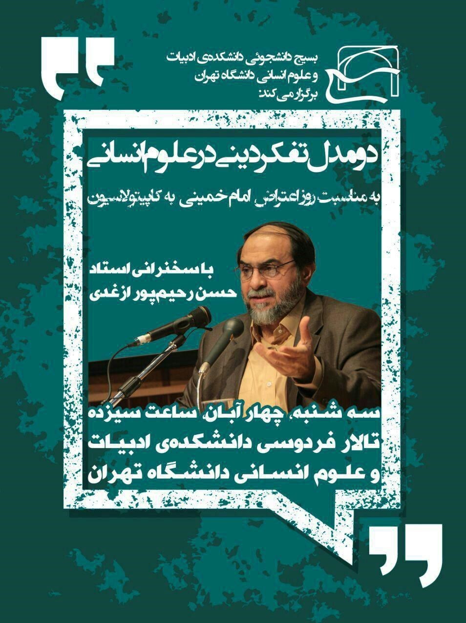 به گزارش خبرنگار گروه دانشگاه باشگاه خبرنگاران تسنیم«پویا»، همایش «دو مدل تفکر دینی در علوم اسلامی» به مناسبت روز اعتراض امام خمینی(ره) به کاپیتولاسیون، سهشنبه (4 آبان ماه) با سخنرانی حسن رحیمپور ازغدی در دانشگاه تهران برگزار میشود.