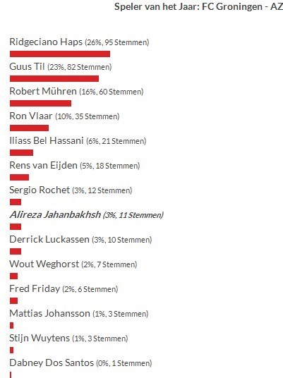 سایت رسمی هواداران باشگاه آلکمار پس از پایان این بازی با برگزاری یک نظرسنجی نسبت به انتخاب بهترین بازیکن این تیم در بازی برابر گرونیخن اقدام کرد که هاپس، مدافع 23 ساله این عنوان را به دست آورد. علیرضا جهانبخش نیز با دریافت 3 درصد آرای هواداران آلکمار در جایگاه هشتم رده بندی بهترین بازیکن هفته دهم قرار گرفت.