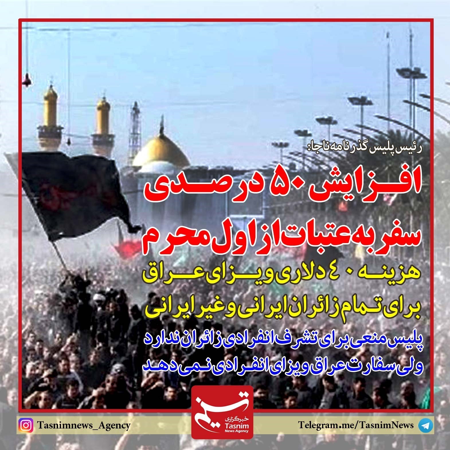 رئیس پلیس گذرنامه و مهاجرت نیروی انتظامی با اشاره به افزایش 50درصدی سفر به عتبات از ابتدای محرم، از صدور ویزا به‌صورت مانیفستی توسط دولت عراق خبر داد و گفت: در صورت داشتن ویزای کشور عراق منعی برای تردد انفرادی زائران توسط پلیس وجود ندارد.