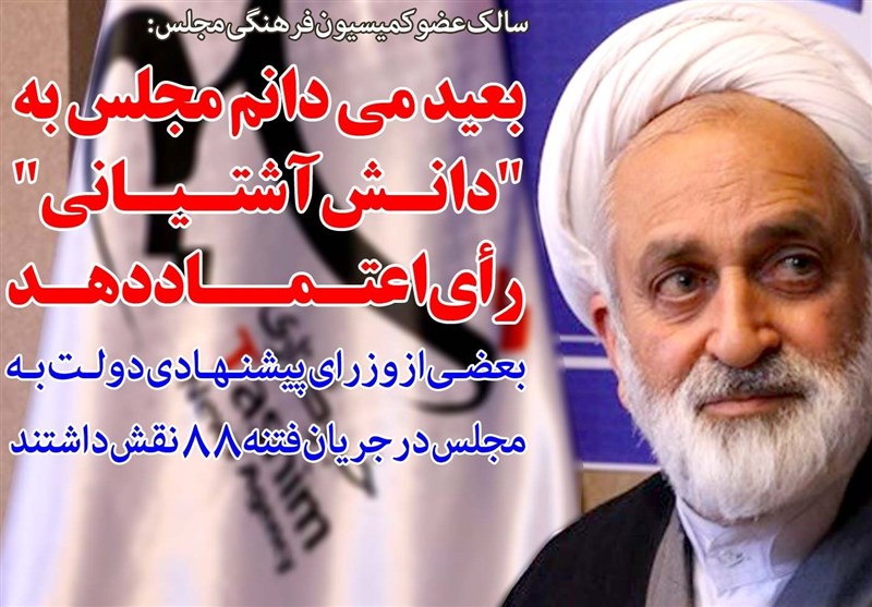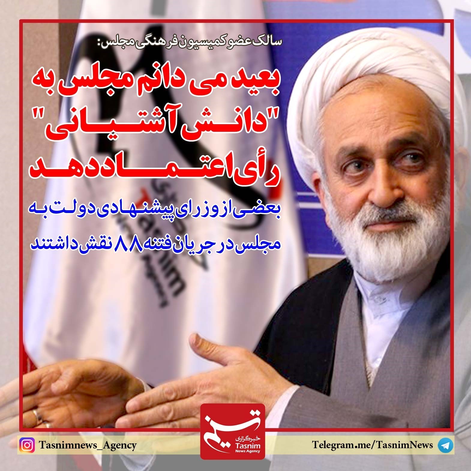 نماینده مردم اصفهان در مجلس با بیان اینکه بعضی از وزرای پیشنهادی دولت به مجلس در جریان فتنه 88 نقش داشتند، گفت: بعید می‌دانم که مجلس شورای اسلامی به دانش آشتیانی برای تصدی وزارت آموزش و پرورش رأی اعتماد دهد.