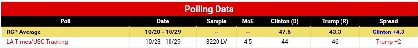 نظرسنجی دیگری که روزنامه آمریکایی لس آنجلس تایمز در مورد انتخابات فلوریدا برگزار کرده نیز نشان می دهد ترامپ با اختلاف 2 امتیاز از کلینتون پیش افتاده است. براین اساس ترامپ با 46 امتیاز از کلینتون که 44 امتیاز دارد جلو تر است.