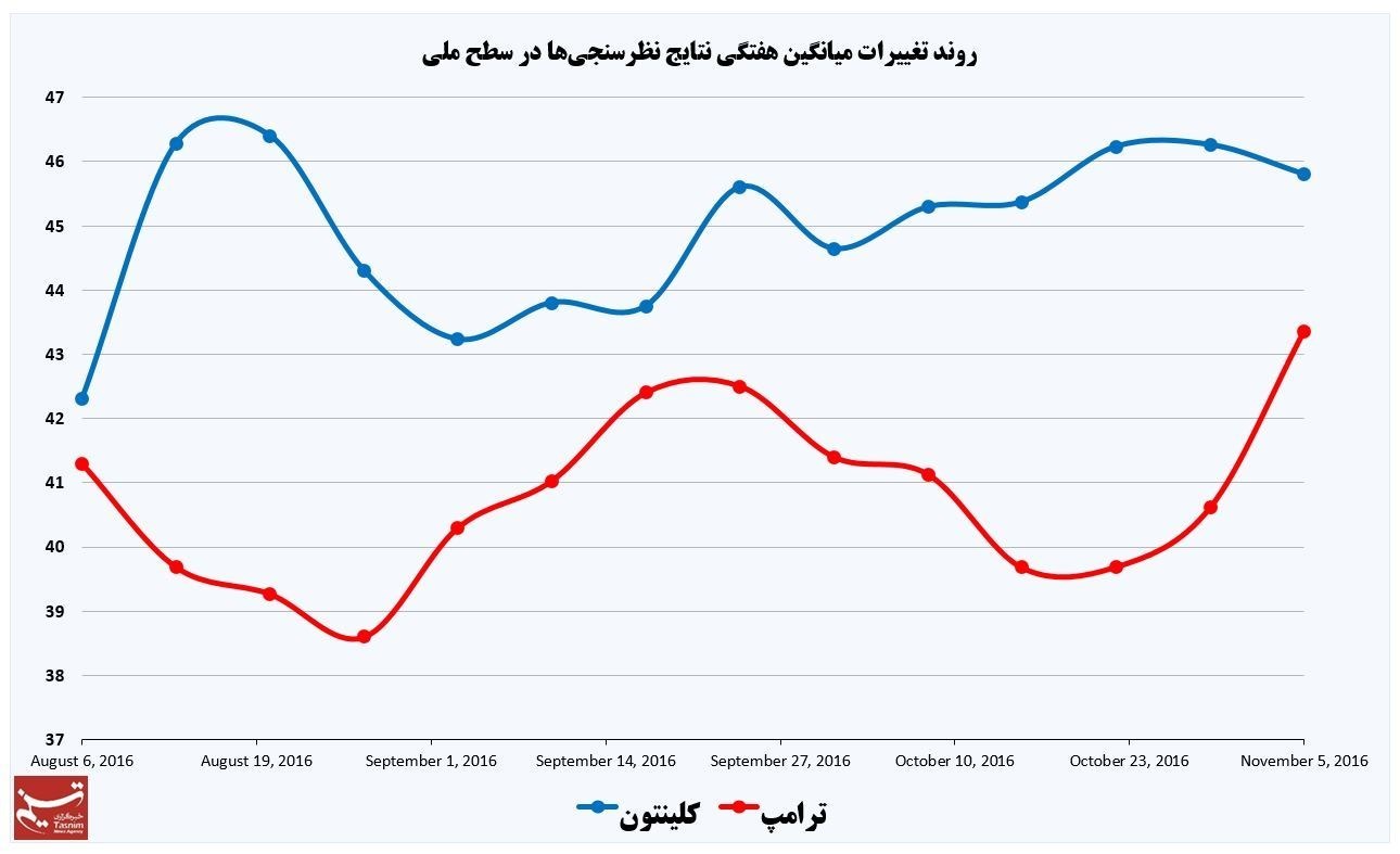 بررسی روند تغییرات نظرسنجیها در سطح ملی هم الگویی مشابه را نشان میدهد، نکته قابل توجه در این میان، رشد خیرهکننده اقبال عمومی به ترامپ است، با همه اینها، کلینتون هرچند کمی از محبوبیت خود را از دست داده است، اما همچنان با جلب 45.8 درصد اقبال عمومی، فاصلهای 2.45 درصدی با ترامپ (43.35 درصد) دارد.