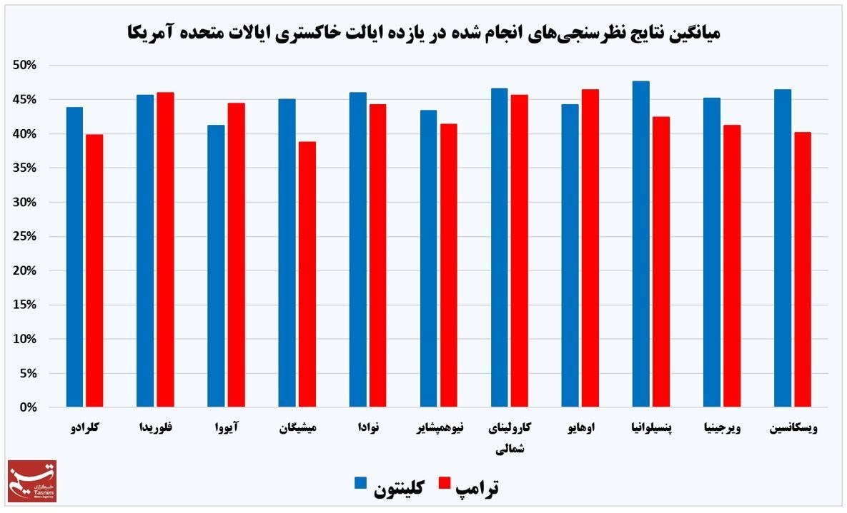 بررسی نتایج نظرسنجیهای اخیر در این یازده ایالت نشان میدهد که کلینتون در مجموع همچنان از ترامپ جلوتر است؛ هرچند که فاصله این دو رقیب با احتساب نظرسنجیهای انجام شده طی هفته اخیر تا حد قابل توجهی کاهش یافته است. در حال حاضر ترامپ در 3 ایالت آیووا و اوهایو و فلوریدا توانسته است اکثریت اقبال عمومی را بهسوی خود جلب کند، و در 8 ایالت از کلینتون جا مانده است. بین این 8 ایالت دیگر نیز بیشترین فاصله این دو رقیب در ایالتهای ویسکانسین و میشیگان است، جایی که کلینتون در هر دو ایالت فاصلهای 6.2 درصدی با ترامپ دارد.