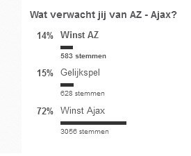 72 درصد آرای نظرسنجی مجله هلندی به گزینه پیروزی آژاکس اختصاص یافت و 15 درصد نیز به نتیجه تساوی رای مثبت دادند. آلکمار و آژاکس آمستردام امروز (یکشنبه) در چاروچوب هفته دوازدهم اردویژه هلند در ورزشگاه آفاس به مصاف هم می روند.
