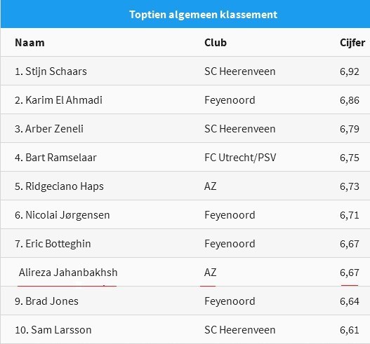علیرضا جهانبخش نیز با دریافت امتیاز 6.78 جایگاه هشتمی برترین های اردویژه هلند را کسب کرده است. رودریگز هاپس دیگر هم تیمی جهانبخش بهترین بازیکن آلکمار در این رده بندی با قرار گرفتن در جایگاه پنجمی و امتیاز 6.73 محسوب می‌شود.