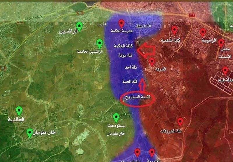 به گفته این منبع، رزمندگان مقاومت توانستند خط کمک رسانی به تروریستها در پروژه 1070 را قطع کنند که در نتیجه آن، دهها تروریست به محاصره درآمدند و همزمان درگیریهای شدیدی برای آزادسازی تپه «مؤتة» جریان دارد که با آزادسازی آن، مواضع تروریستها در پروژه 1070 و مدرسه الحکمه در غرب حلب در تیررس آتش ارتش قرار میگیرد و خطوط امدادرسانی به تروریستها از سمت محور جنوبی قطع خواهد شد.