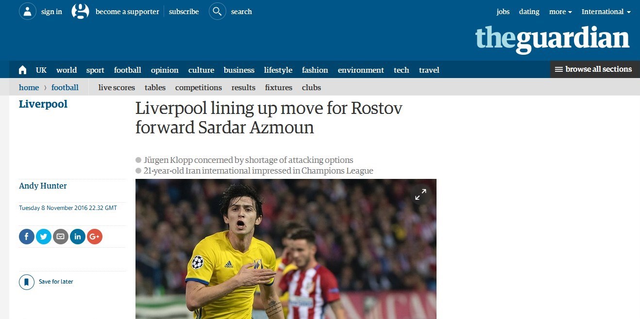 به نوشته گاردین، پیش از این هم اخبار متعددی درباره تمایل چند باشگاه لیگ برتری از جمله اورتون و استوکسیتی برای جذب سردار آزمون منتشر شده بود چرا که او از زمان انتقالش از روبین کازان توجه آنها را جلب کرده است. حالا لیورپول با مدیر ورزشی جدیدش مایکل ادواردز که مسئولیت امور مربوط به نقلوانتقالات باشگاه را برعهده گرفته است، آزمون را برای این فصل در نظر گرفته و قصد دارد با آغاز بازار نقلوانتقالات ماه ژانویه با باشگاه روستوف وارد مذاکره شود.