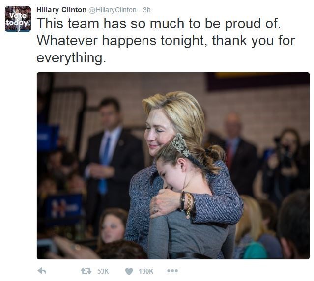 کاندیدای دموکرات انتخابات ریاست‌جمهوری که تا این لحظه از رقیب جمهوری‌خواهش عقب مانده است، در توئیتی خطاب به هوادارانش نوشت: هر اتفاقی که امشب بیفتد باز هم از شما به‌خاطر همه چیز ممنونم.