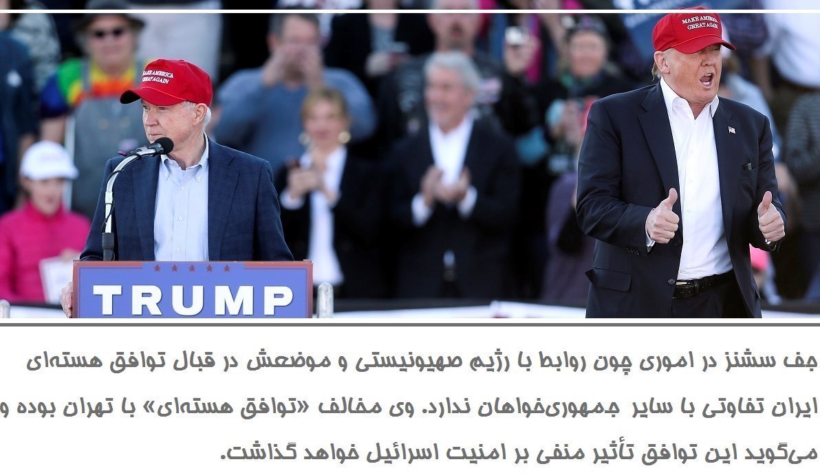 ترامپ در 1 مارس جف سشنز، سناتور جمهوریخواه از ایالت آلاباما، را به عنوان مشاور اصلیاش در حوزه امنیت ملی و رئیس کمیته مشورتی امنیتی ملی معرفی کرد. سشنز یک پروتسنان آوانجلیکال محافظهکار است. وی به مانند ترامپ مخالف مهاجرت مسلماان به آمریکا بوده و عموما به داشتن دیدگاههایی سختگیرانه درباره مهاجرت شهرت دارد. سشنز یکی از اعضای کمیته نیروهای مسلح سنا بوده و به عنوان یکی از شاهینهای جمهوریخواه شناخته میشود.