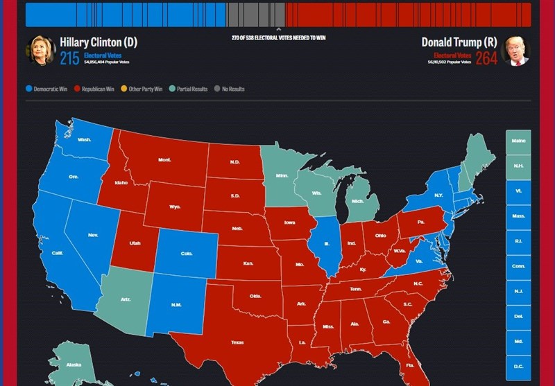 ترامپ تاکنون توانسته آرای 264 هیئت نمایندگی انتخاباتی در آمریکا را از آن خود کند و کلینتون تنها به آرای 215 هیئت انتخاباتی دست یافته است. برای پیروزی نهایی نامزدهای انتخاباتی باید به میزان 270 هیئت انتخاباتی دست یابند.