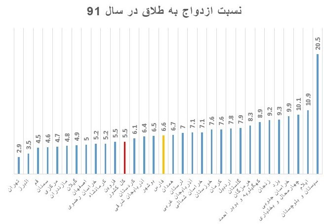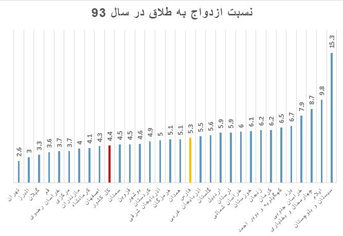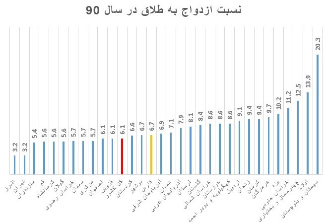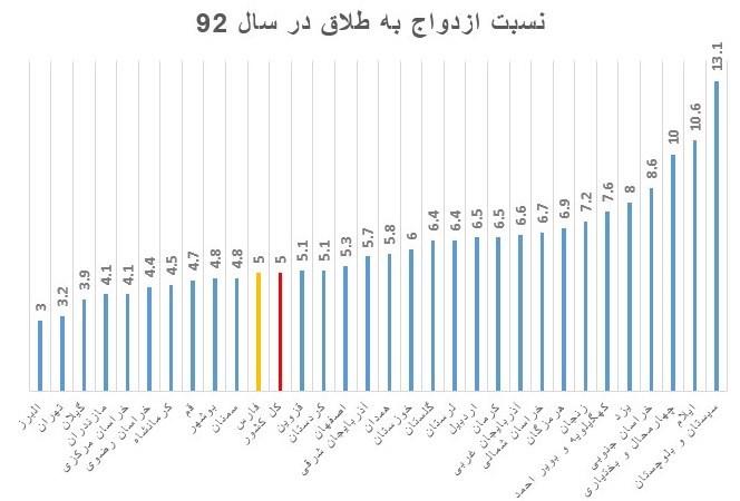 در 5 سال گذشته نسبت ازدواج به طلاق در استان فارس روند کاهشی داشته است به طوری که از نسبت 6.7 در سال 90 به نسبت 5.4 در سال 94 رسیده است که این خود زنگ خطری جدی برای بنیان خانواده محسوب میشود.