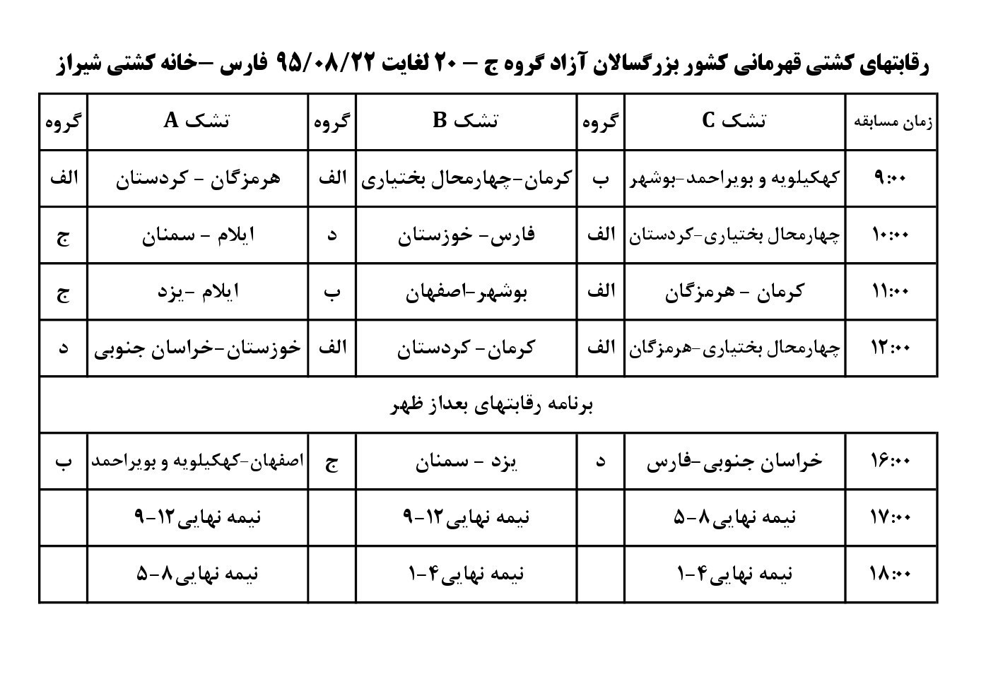 به گزارش خبرگزاری تسنیم از شیراز، جدول کامل این رقابت‌ها که در خانه کشتی شیراز برگزار می‌شود به شرح زیر است:
