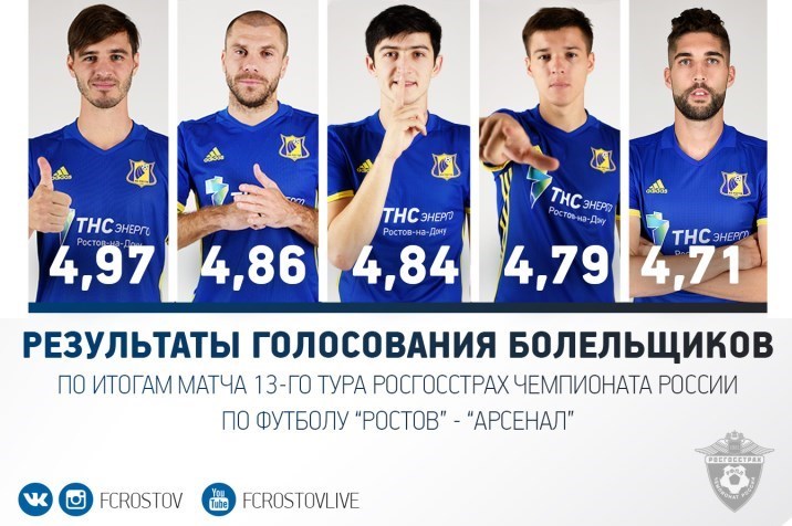 تیموفی کالاچف با دریافت امتیاز 4.86 رتبه دوم نظرسنجی را به دست آورد و جایگاه سومی نیز با امتیاز 4.84 در اختیار سردار آزمون قرار گرفت. دمیتری پولوز و گرانات رتبههای چهارم و پنجمی برترین بازیکنان روستوف در بازی هفته سیزدهم لیگ برتر روسیه را کسب کردند. در این بازی سعید عزتاللهی، دیگر ملیپوش ایرانی روستوف به میدان نرفت.