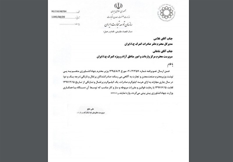 بنابراین گزارش در این نامه آمده است: بنابر پینوشت وزیر صنعت، معدن و تجارت برنامه وزیر کشاورزی به اطلاع میرساند صادرات کنندگان پرتقال و نارنگی درجه یک و دو در سالجاری مجازند به ازای هر 3 کیلوگرم صادرات این محصولات یک کیلوگرم پرتقال و نارنگی خارجی وارد کنند.
