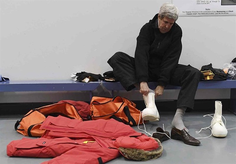 به گزارش گروه رسانه های خبرگزاری تسنیم، جان کری در مرکز بین المللی قطب جنوب لباس‌های مقاوم به سرمای بسیار شدید را می‌پوشد.