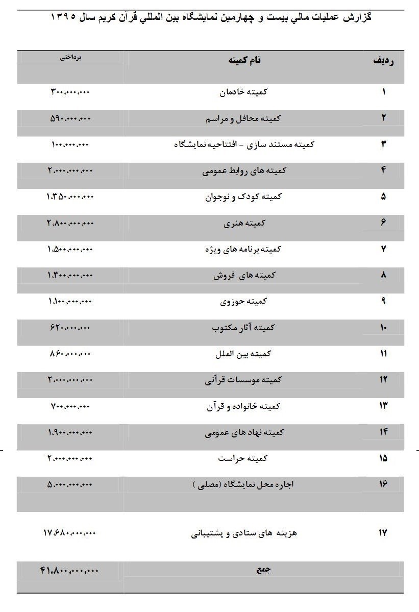 معاونت قرآن 500 میلیون تومان برای اجاره بهای مکان برگزاری این نمایشگاه پرداخت کرده و سایر هزینههای اجرایی نمایشگاه شامل کمیته روابط عمومی و حراست، هر یک 200 میلیون تومان بوده است.